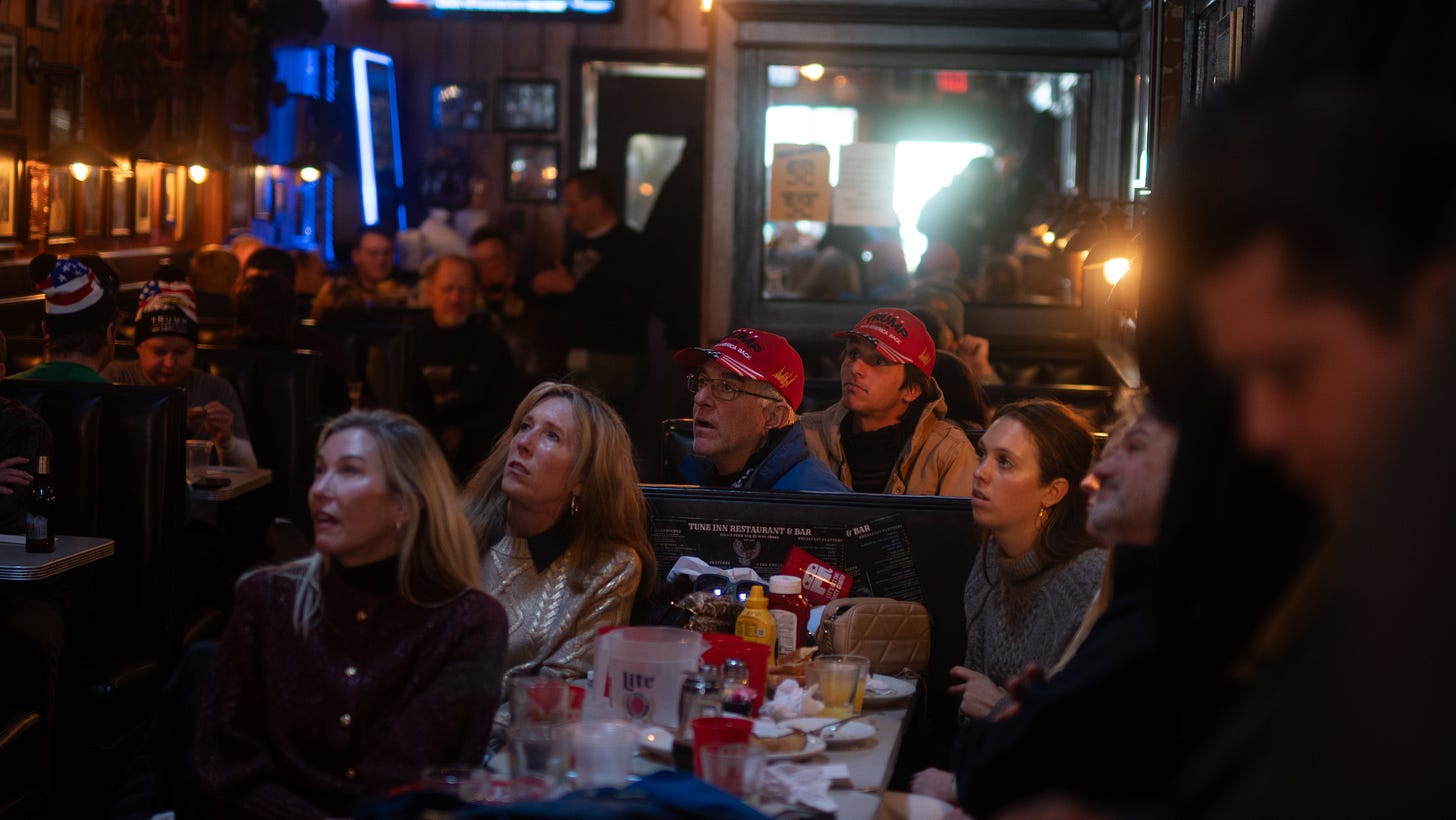 I bounced around a few different GOP watch parties along Capitol Hill on Monday, taking in the scene with the Trump faithful. I spent the most time at Tune Inn, a dive within spitting distance of the Capitol that I’ve spent a lot of time and treasure. It was standing room only and quite a different crowd than the usual scene of staffers and reporters jockeying for the Touch Tunes. This crowd cheered for the right figures, booed President Obama, and one guy wearing an American flag yelled that he was keeping track of everyone not clapping for Trump when he flashed on the screen.